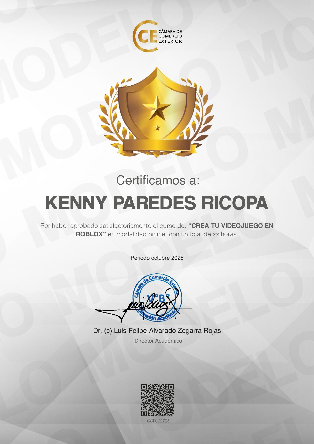 El certificado es una credencial oficial de la Cámara de Comercio y Educación, la cual confirma haber completado correctamente el curso. Dicho certificado puede ser validado desde cualquier parte del mundo a través de un QR en nuestra web o Contact Center.